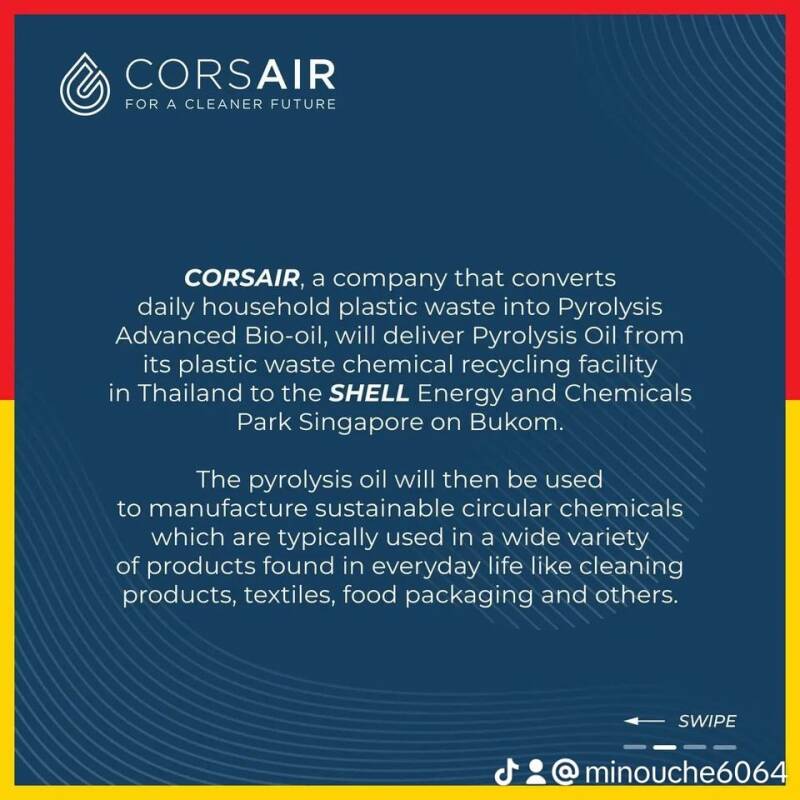 Ce 12 février 2024 est un jour HISTORIQUE : Corsair Group International vient de signer un contrat avec SHELL pour lui fournir à du pétrole Bio de pyrolyse, une matière première de déchets plastiques mixtes.